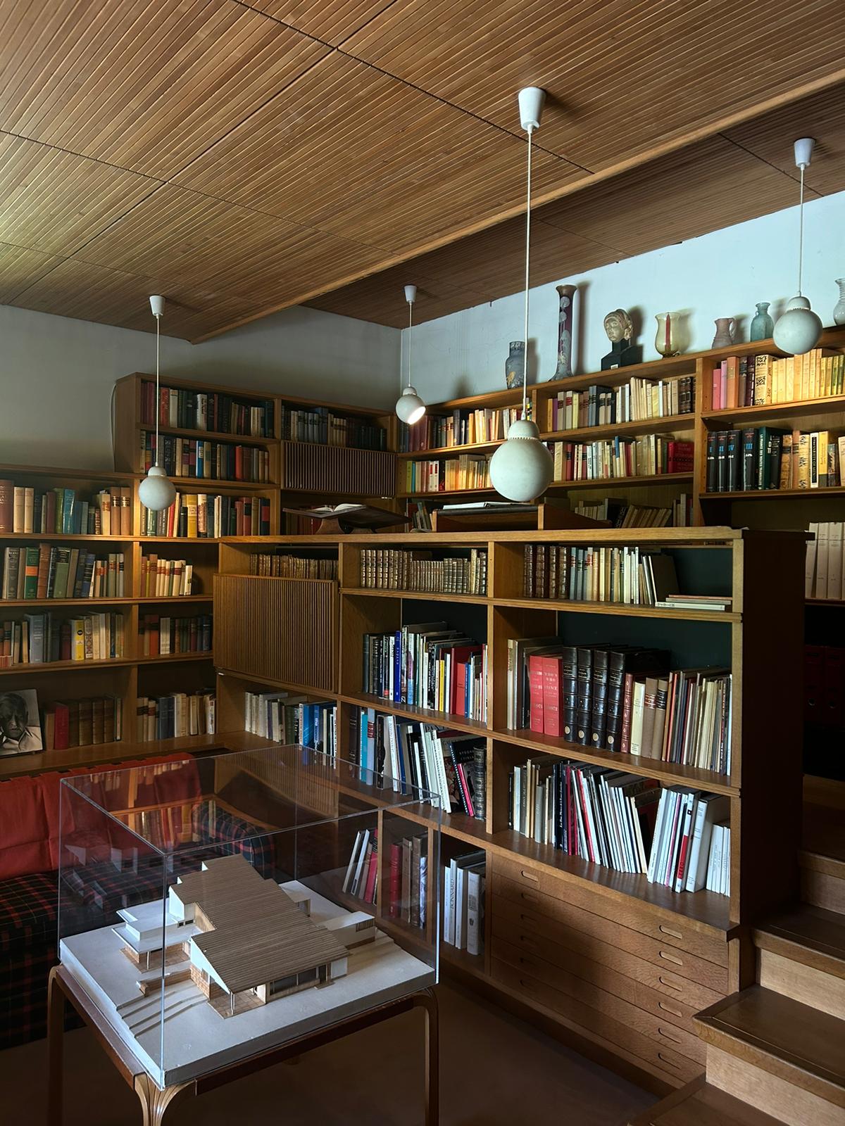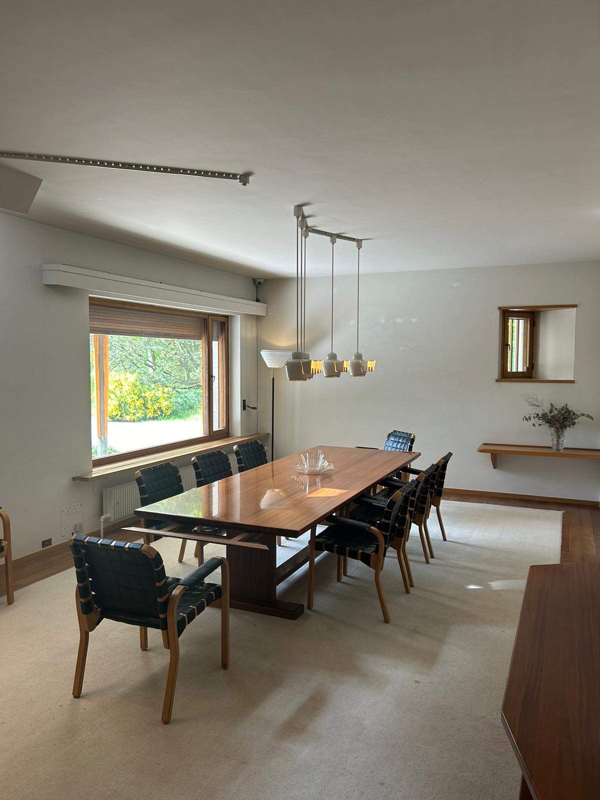 L’ensemble du mobilier et des luminaires provient d’Artek, la marque qu’il avait fondée avec son épouse Elissa pour additionner l’art et le fonctionnel. Chaque objet, du fauteuil aux lampes, s’intègre naturellement à l’espace, comme une extension de la maison elle-même, comme un prolongement naturel des matières qui enrobent la maison.