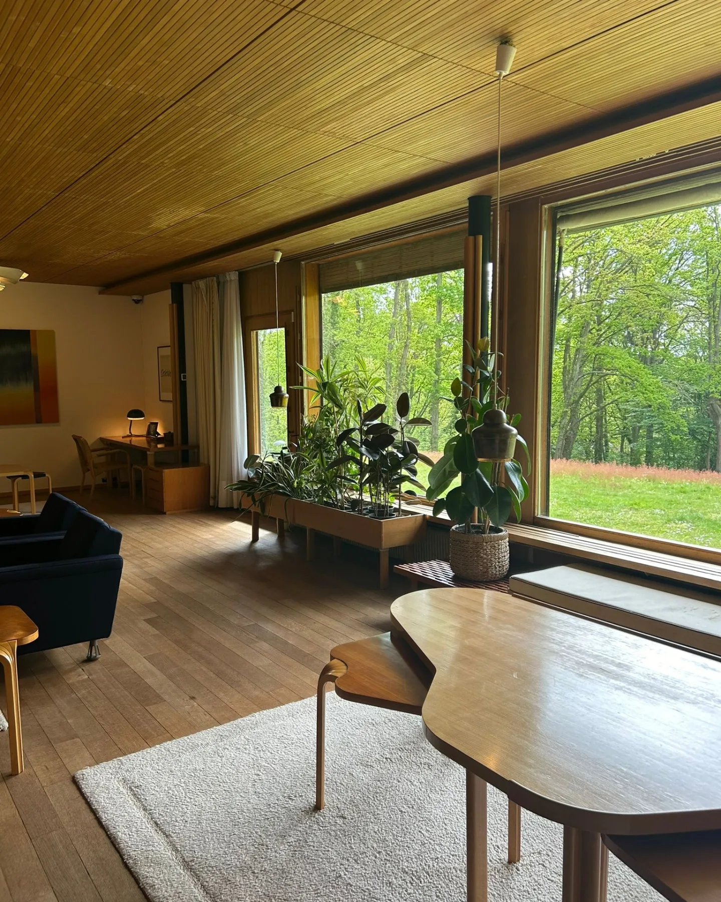 Contrairement à la froide transparence de la Glass House du génial Philip Johnson, Aalto choisit ici la chaleur du bois, la douceur de la lumière, l’intimité du lieu. Sa maison se confond dans le paysage, épouse la pente qui révèle une piscine inattendue. Le fonctionnalisme n’est ici plus un dogme, mais un langage au service du confort et de la sensibilité. Son fonctionnalisme n’est pas une théorie mais une manière d’habiter : un équilibre entre rigueur et émotion, entre ligne et matière.